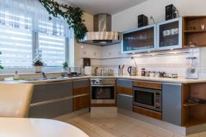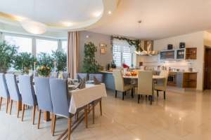 W pełni wyposażona kuchnia z kuchnią indukcyjną, piekarnikiem, zmywarką oraz mikrofalówką. Dodatkowo oddajemy do dyspozycji Gości ekspres do kawy, wyciskarkę do soków, maszynkę do krojenia chleba, toster i mikser oraz blender ręczny. Kuchnia połączona jest z jadalnią w której może na życzenie gości zasiąść 28 osób. Jadalnia (30 m2) jest połączona z kuchnią (14 m2) oraz salonem (119 m2). Na wyposażeniu jest również: deska do prasowania, żelazko, suszarka do włosów.