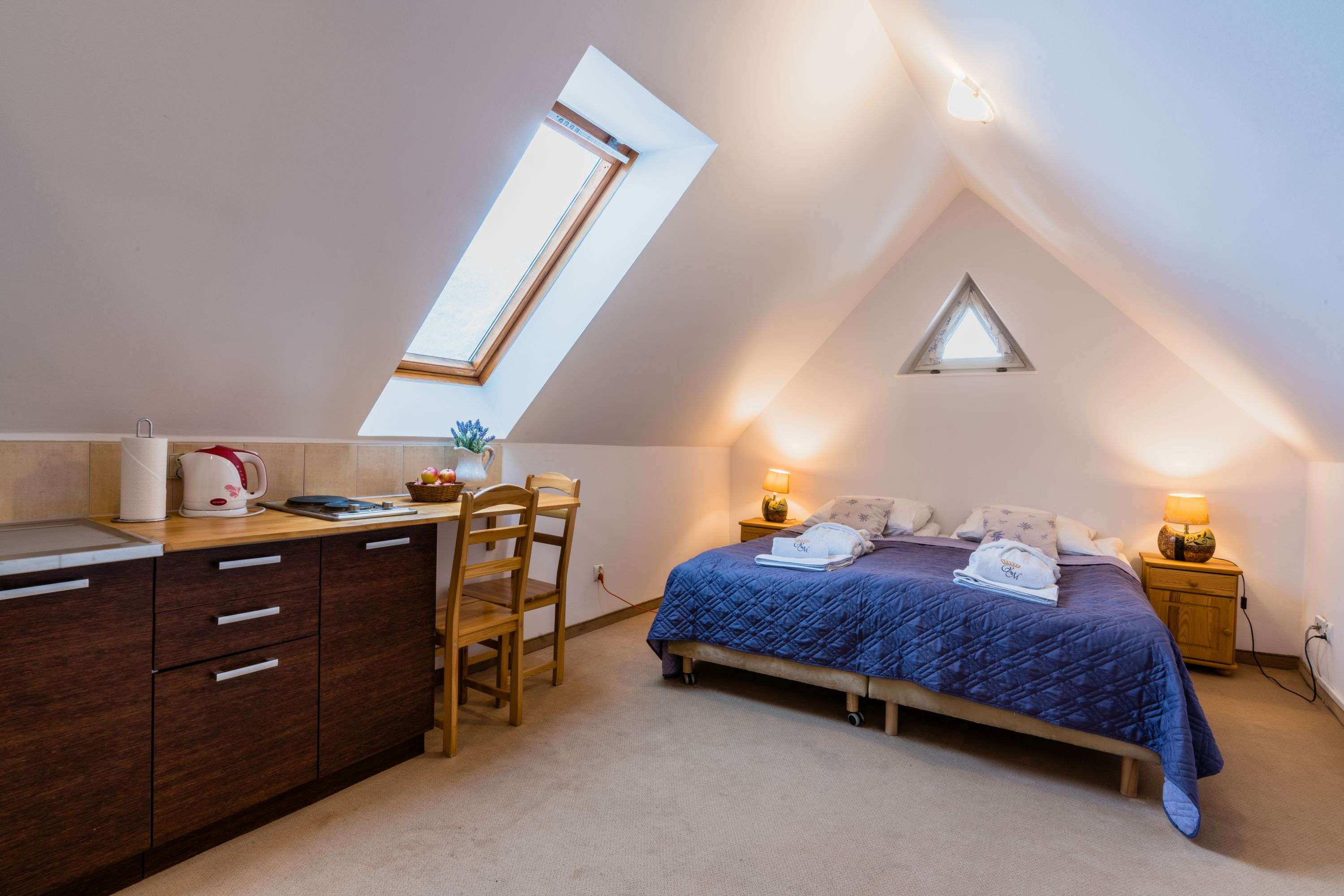 Jest to mały przytulny pokoik dwuosobowy na drugim piętrze ze skosami. Wyposażony w łóżko małżeńskie (możliwość rozsunięcia), aneks kuchenny. Z pokoju wchodzi się do łazienki z prysznicem. W pokoju znajduje się telewizor z telewizją kablową.