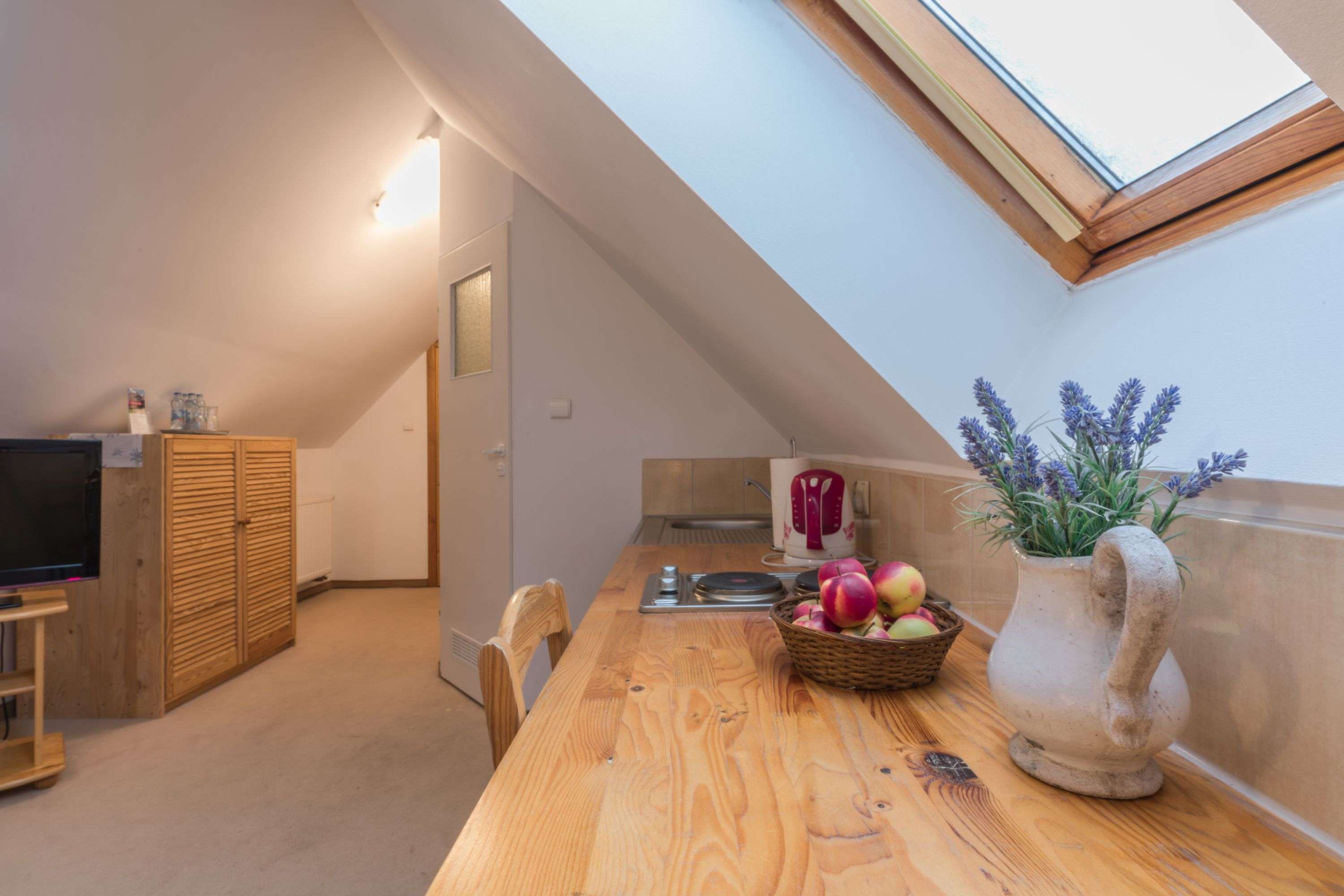Apartament Słoneczny (I piętro), Bursztynowy i pokój Lawendowy (II piętro) są z aneksami kuchennymi i wejście do nich jest z klatki schodowej.